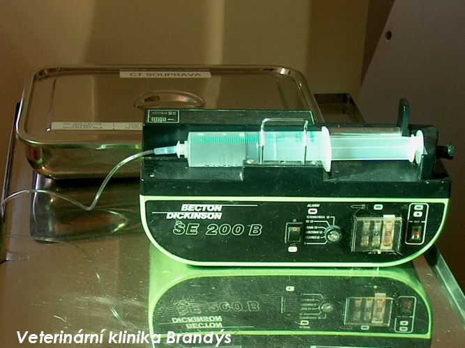 Automatický injektor slouží k podání kontrastní látky do žíly při CT angiografickém vyšetření.